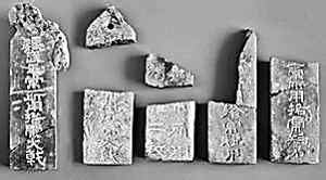 墓地出土(或從盜墓賊處繳獲)的石牌和石枕,有關(guān)方面認(rèn)為是根本性的確證。圖一中有兩塊石牌寫著魏武王大戟,這是很有意思的,因?yàn)槲覀兛吹降氖鞘撇皇俏淦麝旧?。牌子是說明實(shí)物的,如何根據(jù)牌子證明這就是曹操的墓地呢?牌子上面寫著魏武王常用格虎大戟,表明這是在說明商品的名稱,而不是說這是曹操的遺物。再看圖二計(jì)21枚牌子,這些牌子上面都有孔,以作懸掛用,上面寫的多是物品名數(shù),如胡粉二斤、黃豆二升之類。如果把這些看成是遺物陪葬,那就不免奇怪了。因此這些所謂遺物應(yīng)該是陳列的商品招牌,那么這幾間陰室要么是做過倉庫,要么就是堆放過商品。而這些牌子只是為了說明記錄這些貨物用的。從稱呼上看,曹操生前先封為“魏公”,后賜九錫,進(jìn)爵為“魏王”,死后謚號(hào)為“武王”,其子曹丕稱帝后追尊為“武皇帝”,史稱“魏武帝”。出土石牌、石枕刻銘稱“魏武王”,名稱倒是不錯(cuò),但石枕形貌不是生活中可以適用的物品,應(yīng)該出自偽造。從物品所刻字體看,刻工水平很差,所以只能是來自民間藝人所作,因?yàn)閺谋I墓人手中獲取,也不排除盜墓人游戲之作。