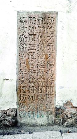 “坊墻之內(nèi),不得私行開門并奉祀神佛、搭蓋遮蔽、寄頓物件,以防疏虞;三社官街,禁排列木料等物。光緒辛巳年文儒坊公約?!?br/>