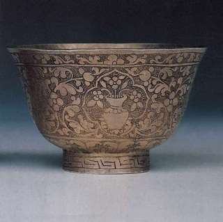 元代銀器,可說(shuō)是南宋的延續(xù)。例如附圖就是元代初期制作的銀碗(原本為一雙),雕花別致雅麗,通體錘飾細(xì)膩華美,以中間鏨刻花瓶為核心,圓潤(rùn)工整,令人驟看下,還以為是南宋晚期的代表作。