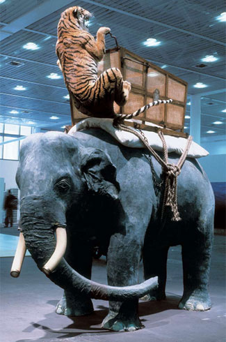 2009 年底,黃永以《方舟2009》為題在巴黎舉辦個展。剛剛過去的2009 年無疑是個讓人膽戰(zhàn)心驚的年份,全球經(jīng)濟危機、迪拜金夢破裂、地震、死亡……黃永以2009 年為背景,運用他自90 年代起常用的動物材料,在巴黎美院那座古典的教堂里,用宣紙糊了一艘被撞癟了一條船,船上都是動物,它們在這艘所謂方舟的空間里,根本就是危機四伏,讓觀者不寒而栗。