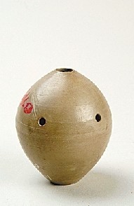 新鄭出土的這件七音孔陶塤,通高10厘米、腹徑3.3厘米、底徑2.6厘米,正面參列5孔,呈“V”字形,背面橫列二孔,孔徑0.4~0.5厘米,銳上一圓形吹孔,直徑1.5厘米,外形如雞卵,完全不同于原始社會到殷代的幾種陶塤,而且音孔排列有序。關(guān)于這七音孔陶塤的時代,有的專家認為是新石器晚期,或說是商代。根據(jù)呂驥的考證,七音孔陶塤的制作年代上限不會超過漢代,或是漢代以后的遺物。七音孔陶塤相對于六音孔陶塤,不僅音色更為渾厚、凄婉,而且增加了不只1個音,為研究探索我國音樂史提供了實物資料。