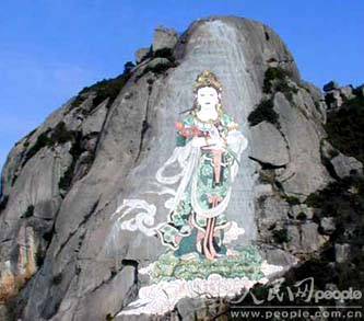 人民網(wǎng)寧波2月13日電 日前,亞洲最大的巖體彩繪壁畫——朱家尖佛山大觀音像在浙江省舟山市朱家尖旅游景區(qū)繪制完工,喜迎游客。該壁畫高69米,寬30米,面積達(dá)2000平方米,采用金箔構(gòu)畫輪廓線,彩色涂料填充畫面,色彩絢麗,造型美觀,堪稱"海上莫高窟"。該壁畫由天津美院楊德樹教授設(shè)計(jì),天津美藝公司負(fù)責(zé)繪制,而且,此觀音像不同于歷史上的所有版本。