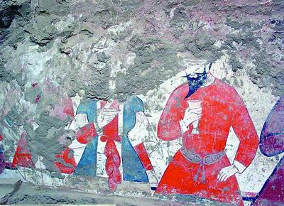 新疆文物考古研究所樓蘭考古隊日前對被盜的墓葬進行初步清理,將墓室中的廢土一桶桶提出,發(fā)現墓壁存有大量精美的壁畫。根據現有樓蘭遺址區(qū)域考古發(fā)現資料判斷,這是首次在樓蘭墓葬中發(fā)現壁畫。圖為樓蘭墓葬中的壁畫。新華社記者張鴻墀攝
