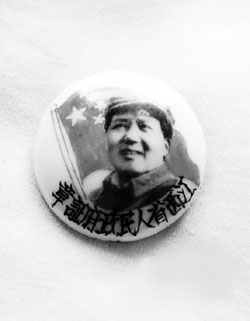 藏品主人向記者出示的毛澤東像章為瓷質(zhì)圓形,直徑2.7厘米,圖案背景為一飄揚的五星紅旗,稍偏右為毛澤東半身戴帽頭像,下方黑色字體“江西省人民政府證章”很是醒目。像章背面同樣是黑色字體注明:“1949年10月1日佩用”,再下面是紅色字體的編號“1094”。