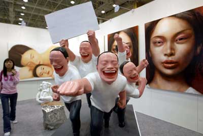 昨天,記者有幸先于觀眾飽覽了此次博覽會(huì)展出的逾萬件當(dāng)代藝術(shù)珍品。記者發(fā)現(xiàn),這些當(dāng)代藝術(shù)作品有油畫、國(guó)畫、雕塑、攝影、噴繪,有招貼設(shè)計(jì),形式多種多樣。它們普遍色彩艷麗、構(gòu)圖生動(dòng),采用多種材料、多種藝術(shù)手段表達(dá)主題,對(duì)于普通觀眾來講,雖然不能完全理解所有藝術(shù)品的內(nèi)涵,但很多藝術(shù)家的奇妙的構(gòu)思和創(chuàng)作,還是能讓我們得到藝術(shù)的享受。