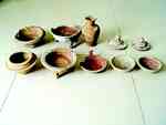 遼金墓3座,其中2座為圓形磚室墓,1座為長方形磚室墓。由于早期被盜,出土隨葬品數(shù)量不多??煞譃樘掌骱痛善鲀深?。其中陶器類有執(zhí)壺、勺、盆、三足盤、罐、甑、扳鍋、撲滿等。瓷器有白釉瓷碗、瓷盤、瓷盞等器,其中一大瓷碗(殘),口徑17.3、底徑6.6、通高7.5厘米。口為蓮瓣形方唇,深腹,足脊方邊、削切而成,內(nèi)底有長方形4個支痕,外足脊有4支痕。胎白細膩,滿釉、釉色白中泛青、瑩潤光澤,釉下施化妝土。瓷盤(殘),口徑16.4、底徑11、通高2.9厘米。為蓮瓣形芒口,平底,內(nèi)外通施釉,無支痕,外足削切平滑,形制精美。胎質(zhì)白而堅細,釉下施化妝土,為定窯系瓷器。