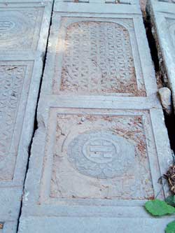 掃去碑上塵土,記者發(fā)現(xiàn),每塊石碑均為能工巧匠精心雕刻而成,十余塊石碑上的圖案竟然無(wú)一雷同。每塊石碑都分為上下兩部分,上部正中雕刻著八卦符號(hào),下部雕刻窗欞圖案,部分碑身左側(cè)雕刻成一個(gè)折頁(yè)狀突起,整體看仿佛一道石門。據(jù)文物愛(ài)好者推測(cè),這十余塊石碑可能為一套仿木結(jié)構(gòu)的石雕門窗,并可能有殘缺。